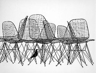 The Eames Wire Chair, introduced in 1951 for the consumer who wanted quality design at a reasonable price. The Eameses molded the seat of their wire chair using cross-woven wires and positioned it on the bent-wire "Eiffel Tower" base. Due to cost restraints, strength requirements, and to further an organic shape, they made the rim of the chair a lighter-gauge wire and doubled it for strength and stability. This advance brought about their first American mechanical patent for design.